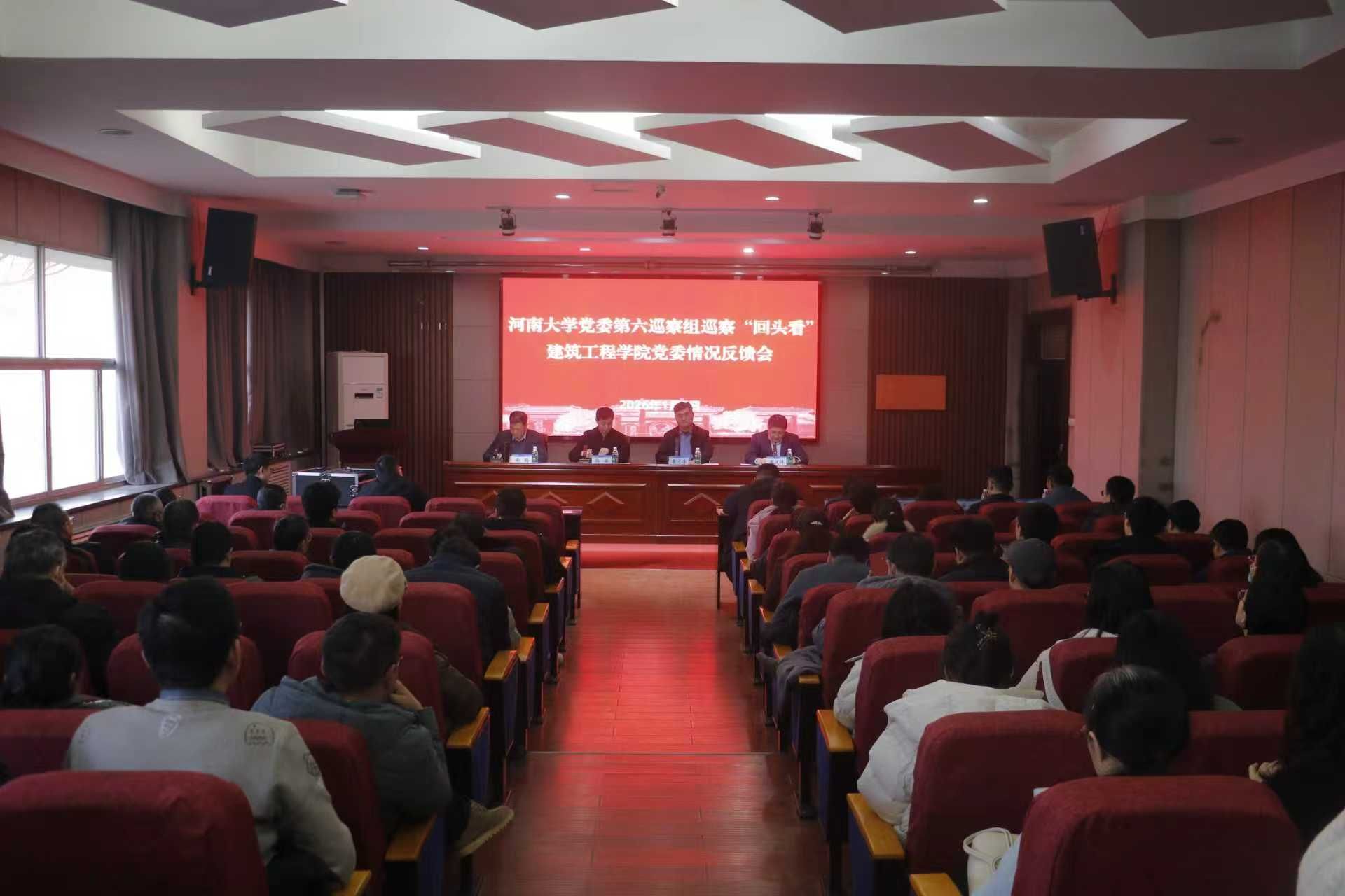 1月8日下午,校党委第六巡察组巡察“回头看”建筑工程学院党委情况反馈会在学院结构实验室学术报告厅召开。校党委组织部副部长兼巡察办副主任郭淼、第六巡察组组长曹志伟、副组长丁丽恒等巡察组全体成员、建筑工程学院全体教职工、离退休教职工及学生代表参会。会议由学院执行院长张建伟主持。会前,巡察组向学院党委主要负责人移交了反馈材料。