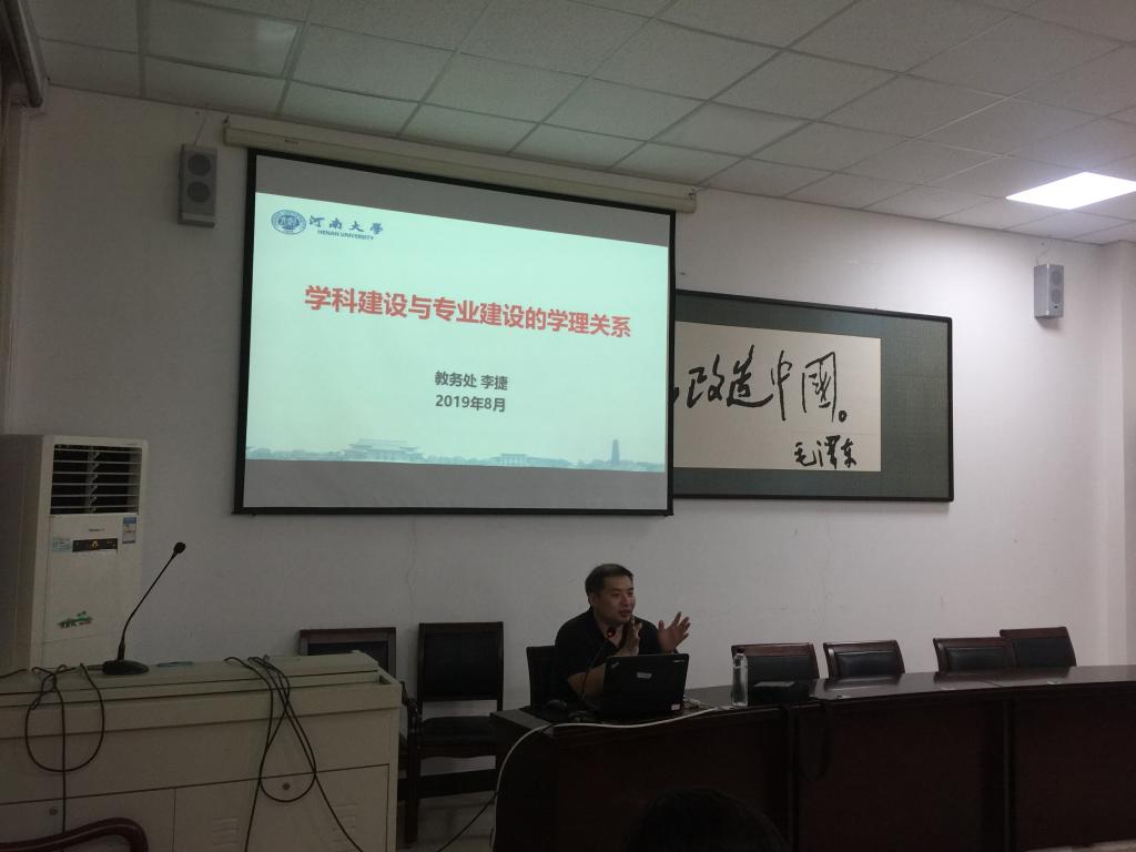 河南大学教务处处长李捷教授,以微信小测试的形式导入新时代本科教育背景下我校专业建设聚焦的问题,这种创新性的授课形式和方法让学员们耳目一新, 随后,李处长作了《学科建设和专业建设的学理关系》的报告,并用思维导图清晰明了的阐述学科评估,他还指出,教师在教学过程中要养成终身学习的习惯,不做教书匠。这些问题导向和报告对我院专业建设和学科建设的发展具有重要的指导意义。