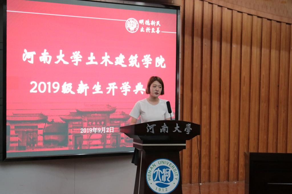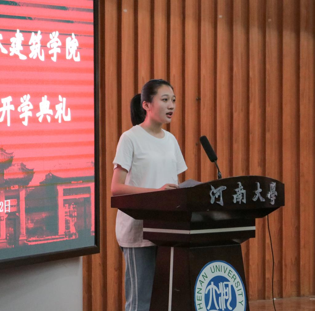 2019级学生代表李嘉阳表达了对河南大学的向往之情和梦想成真的喜悦,她郑重承诺要砥砺品格,博学笃志,发奋图强,用青春诠释誓言,用汗水铸就辉煌。