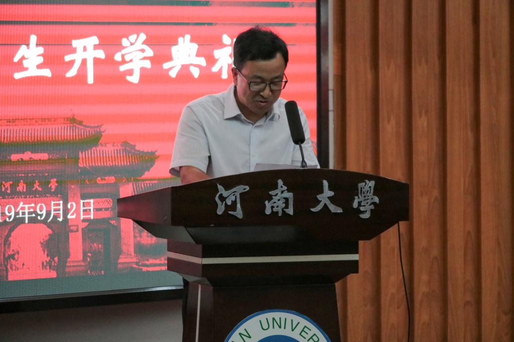 河南大学特聘教授杜文风教授代表全体教师送来了祝福和叮咛。他饱含深情地寄语新同学们要有高尚的志向,大学生和研究生肩负着国家和人民较高的期望,大家应该志存高远,追求卓越,用担重任。同时也要注重身体素质和心理素质的提升,努力学习,博学多才,杜教授勉励新生应该树立理想、刻苦求学、全面提升各项素质和能力,要铁砚磨穿,寒毡坐透,学尽五车书,为实现人生理想奠定坚实的基础。