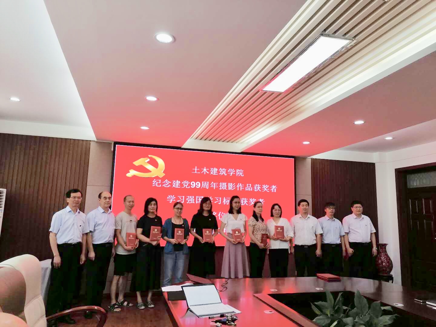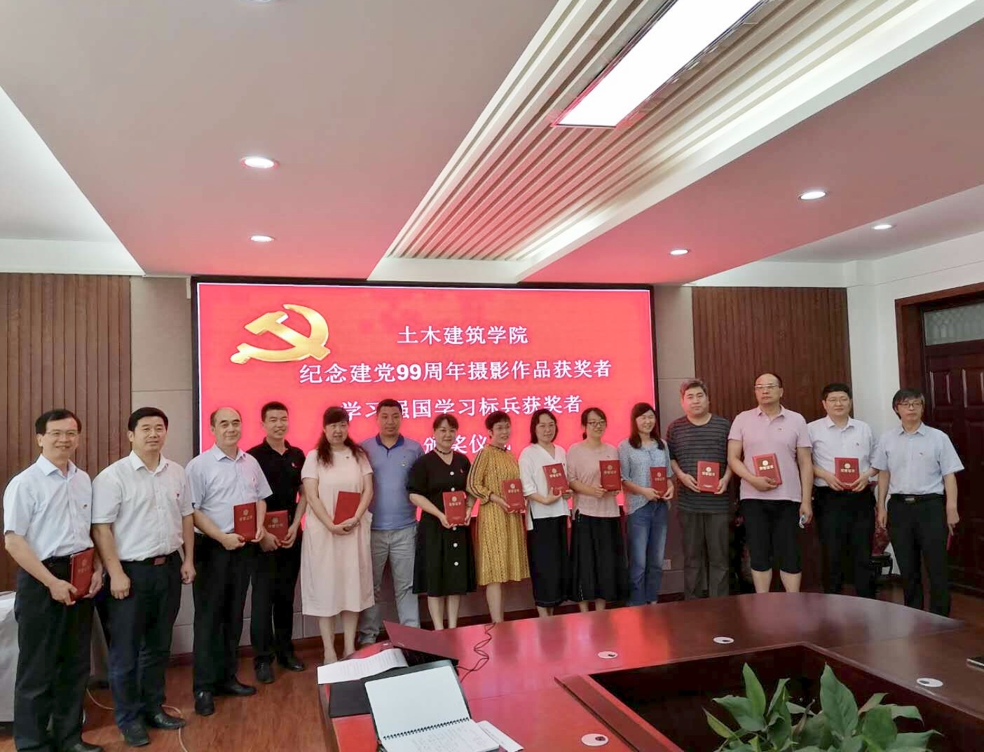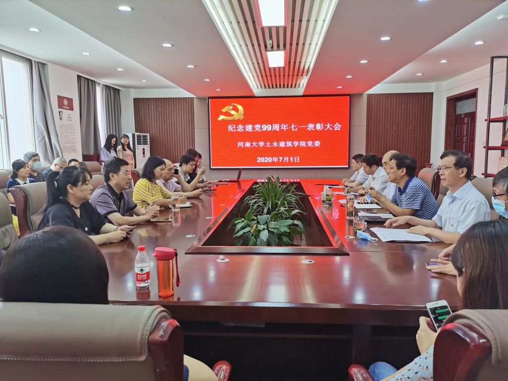 党旗飘飘,党徽闪闪亮,为庆祝中国共产党建党99周年,继续发扬党的优良传统,增强基层党组织创造力、凝聚力和战斗力,土木建筑学院党委于7月1日上午10:30分在院史馆204举行庆祝建党99周年“七一”表彰大会,学院党委委员、支部书记、优秀共产党员、“学习强国”学习标兵等同志参加,会议由党委副书记党玉敬主持。