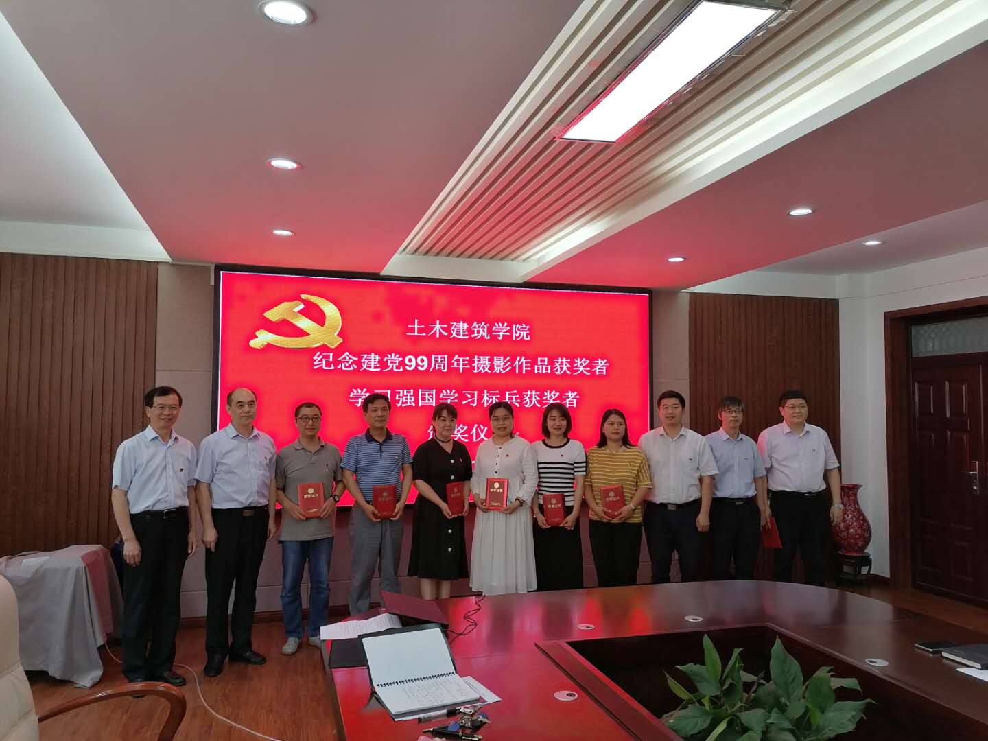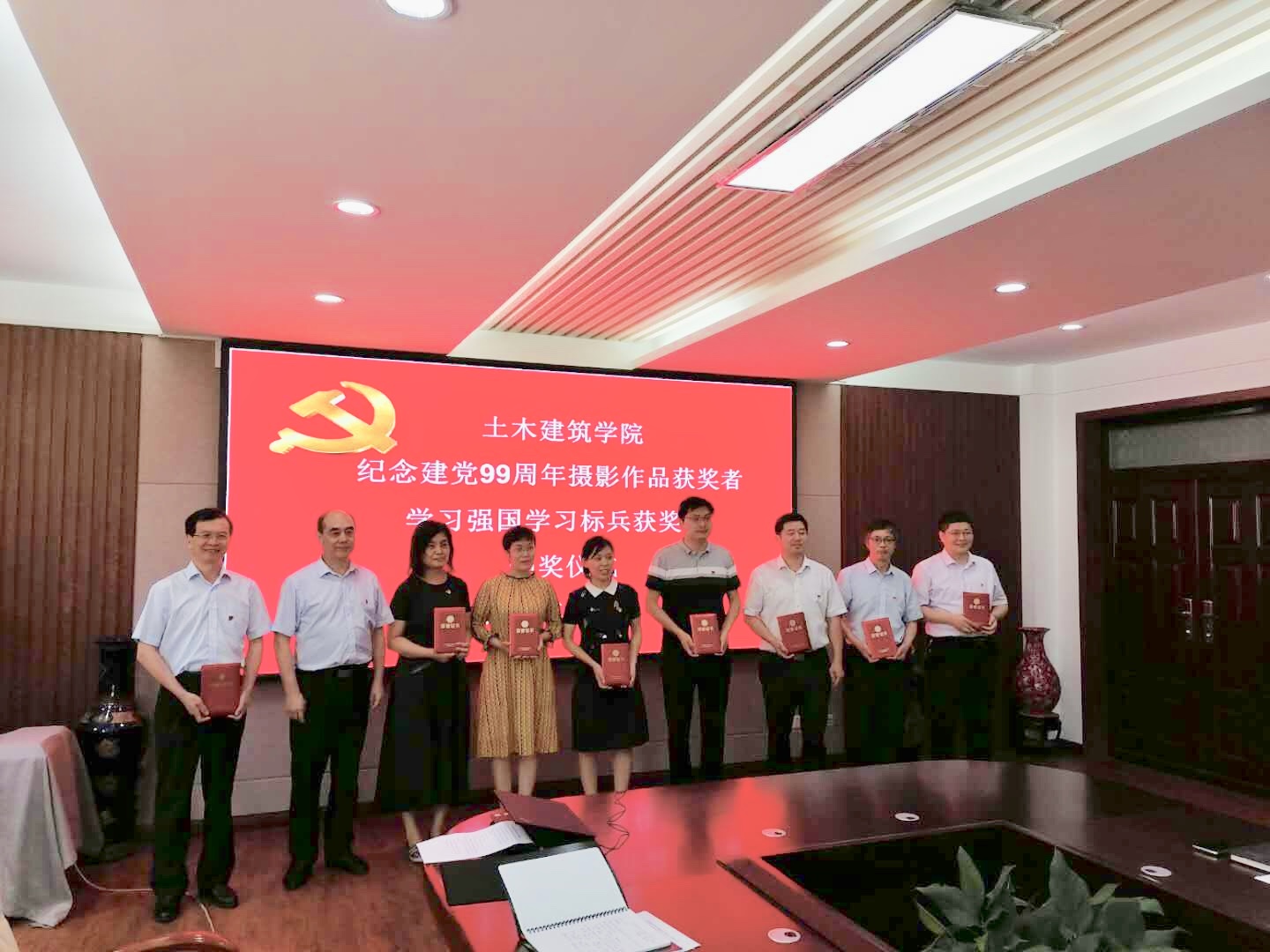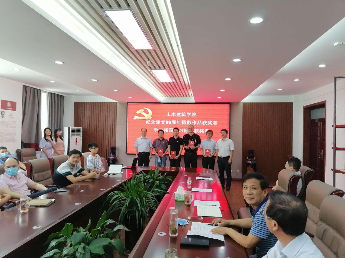 党旗飘飘,党徽闪闪亮,为庆祝中国共产党建党99周年,继续发扬党的优良传统,增强基层党组织创造力、凝聚力和战斗力,土木建筑学院党委于7月1日上午10:30分在院史馆204举行庆祝建党99周年“七一”表彰大会,学院党委委员、支部书记、优秀共产党员、“学习强国”学习标兵等同志参加,会议由党委副书记党玉敬主持。