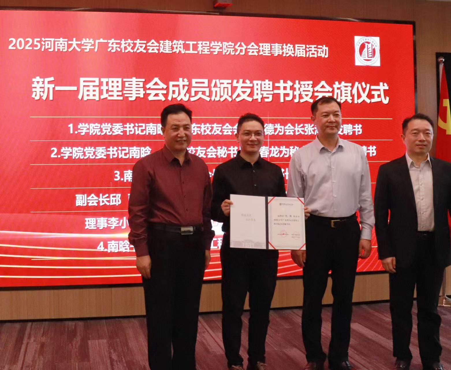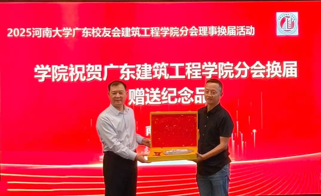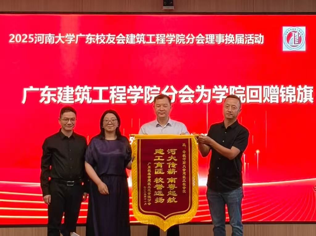 建筑工程学院分会向母校回赠锦旗,锦旗题字为“河大传薪,南粤起航;建工育匠,校誉远扬”,以此表达广东校友建筑工程分会对母校培育之恩的诚挚谢意,以及对母校与学院未来发展的殷切祝愿。