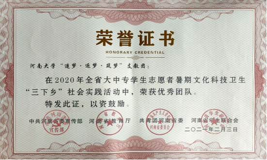 为深入学习贯彻习近平新时代中国特色社会主义思想,切实使青年学生在实践中受教育、增才干、作贡献。河南大学组织开展了2020 年暑期三下乡社会实践活动。我院“造梦·逐梦·筑梦”支教团荣获河南省“优秀团队”称号。