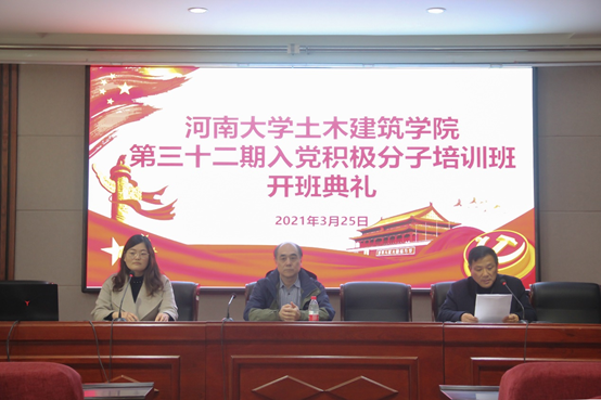 河南大学纪委副书记张秋梅、党委组织部副部长常继科、土木建筑学院党委书记李社教、院长岳建伟、副书记党玉敬、办公室主任魏森杰为入党积极分子做了题为《党章解读共产党员的条件》、《组织发展程序》、《学党史悟思想努力践行党的宗旨》、《共产党人的初心和使命》、《做好意识形态工作 树立共产主义信仰》、《十九届五中全会》专题讲座。