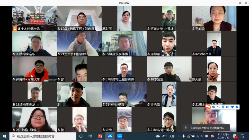 为进一步增进母校与校友的紧密联系、团结凝聚广大校友、引导校友关心母校发展,1月22日上午9:00,土木建筑学院举办“2022年研究生校友新年座谈会”,此次座谈会采取线上线下相结合的方式进行。土木建筑学院党委书记李社教、院长岳建伟、副院长党玉敬、张大伟、张建伟、原华等全体领导及校友办主任杨卫红在土建院校史馆线下参会,各届研究生校友共计110余人在全省各地线上参会。