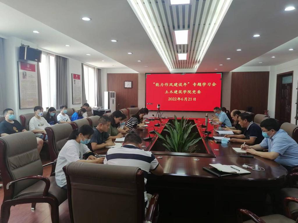 为加强党的建设,规范学院党组织的各项工作,切实转变工作作风,提升工作能力,充分发挥基层党组织的战斗堡垒和党员的先锋模范带头作用,6月21日下午,土木建筑学院在院史馆204开展了线上和线下相结合的“能力作风建设年”专题学习会,学院全体党委委员、支部书记和部分在校研究生党员参加了会议,其他师生党员以线上会议的方式参加,会议由副院长党玉敬主持。