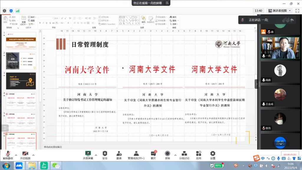 9月4日上午是“规章制度专题”,学院党委副书记赵艳忠按照“日常管理类制度”“奖励类制度”“处罚类制度”,带领同学们,重点学习了《河南大学全日制普通本科学生管理规定》《河南大学全日制普通本科学生学籍管理规定》《河南大学全日制普通本科学生考勤与请销假管理办法》《河南大学全日制普通本科学生奖励办法》《河南大学全日制普通本科学生国家奖助学金管理办法》《河南大学全日制普通本科学生违纪处分办法》等规章制度,并要求同学们在入学教育期间,自主学习其他规章制度。他希望同学们遵规守纪,坚守底线,不触红线,奋发有为,不负青春韶华。