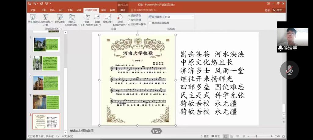 9月3日下午是“学唱校歌”专题,魏森杰向新生同学详细讲解了河南大学校歌的创作背景与创作过程,随后,她带领同学们一起学唱校歌,“嵩岳苍苍,河水泱泱,中原文化悠且长。济济多士,风雨一堂,继往开来扬辉光。四郊多垒,国仇难忘。民主是式,科学允张。猗欤吾校,永无疆。猗欤吾校,永无疆!”那雄浑激昂的旋律,蕴涵着自强不息、百折不挠的河大精神,在欣赏和学唱的过程中,新生同学为之深深感动,沉浸其中。
