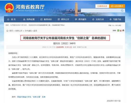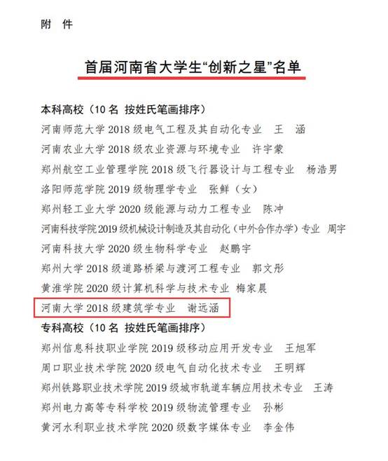 为贯彻落实省委省政府构建一流创新生态决策部署,激发大学生创新创业活力,增强大学生创新思维、创新精神和创业能力,选树新时代大学生创新创业标杆典型,河南省教育厅于2022年5月启动首届河南省大学生“创新之星”遴选活动。此次共评选出年度大学生“创新之星”20名,其中本科高校和专科高校各10名。经过学校推荐、专家评审、网络点赞等环节,我校土木建筑学院2018级建筑学专业本科生谢远涵荣获首届河南省大学生“创新之星”荣誉称号,并获专项经费支持。
