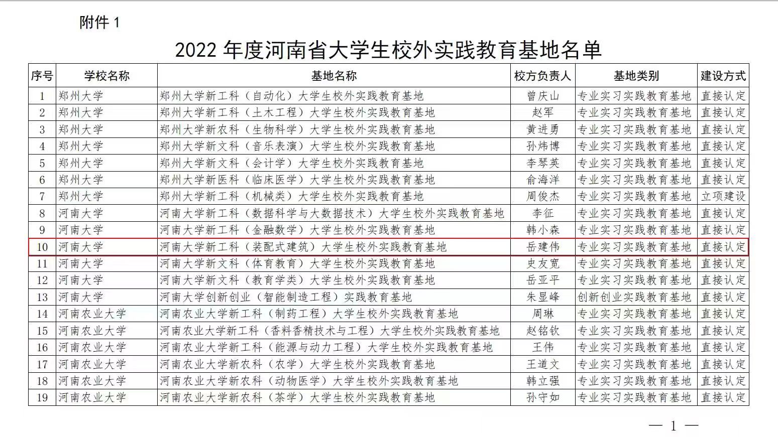 11月25日,河南省教育厅发布《河南省教育厅关于公布2022年度本科高校大学生校外实践教育基地和2020年度立项建设基地验收认定名单的通知》教高〔2022〕358号。我院申报的河南省新工科(装配式建筑)大学生校外实践教育基地被直接认定为省级大学生校外实践教育基地。