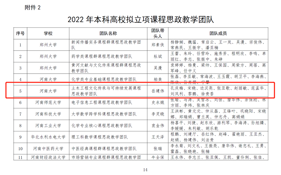 近日,河南省教育厅公布了河南省2022年本科高校课程思政项目评审结果。我院岳建伟教授牵头的《土木工程文化传承与可持续发展课程思政教学团队》获批河南省课程思政教学团队,全校仅两个团队获批。