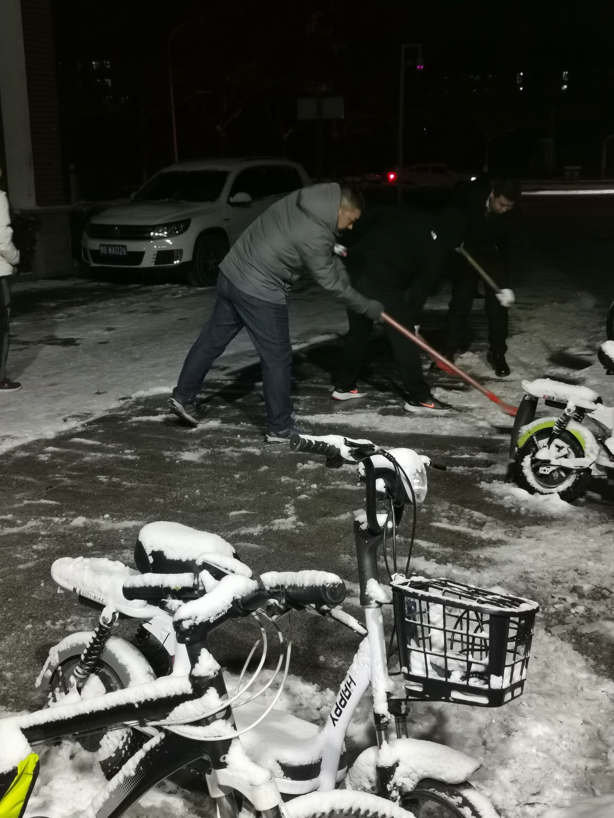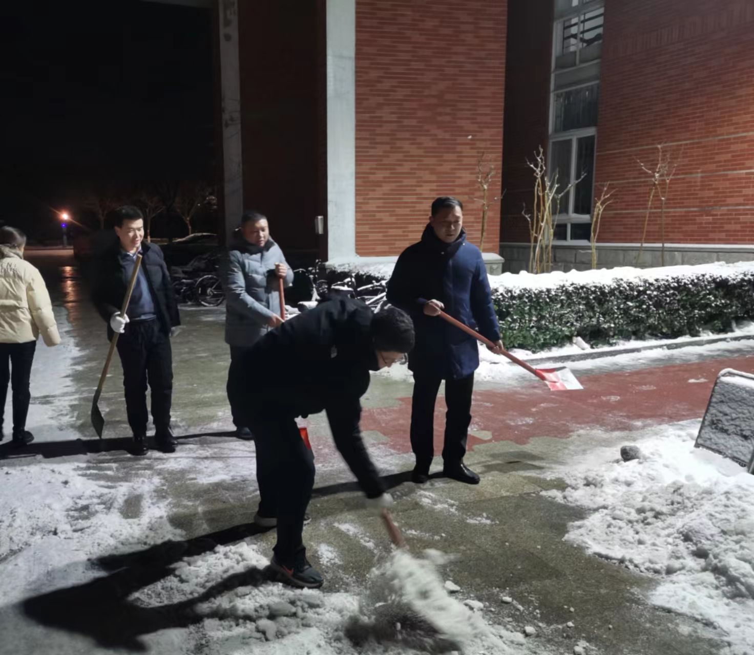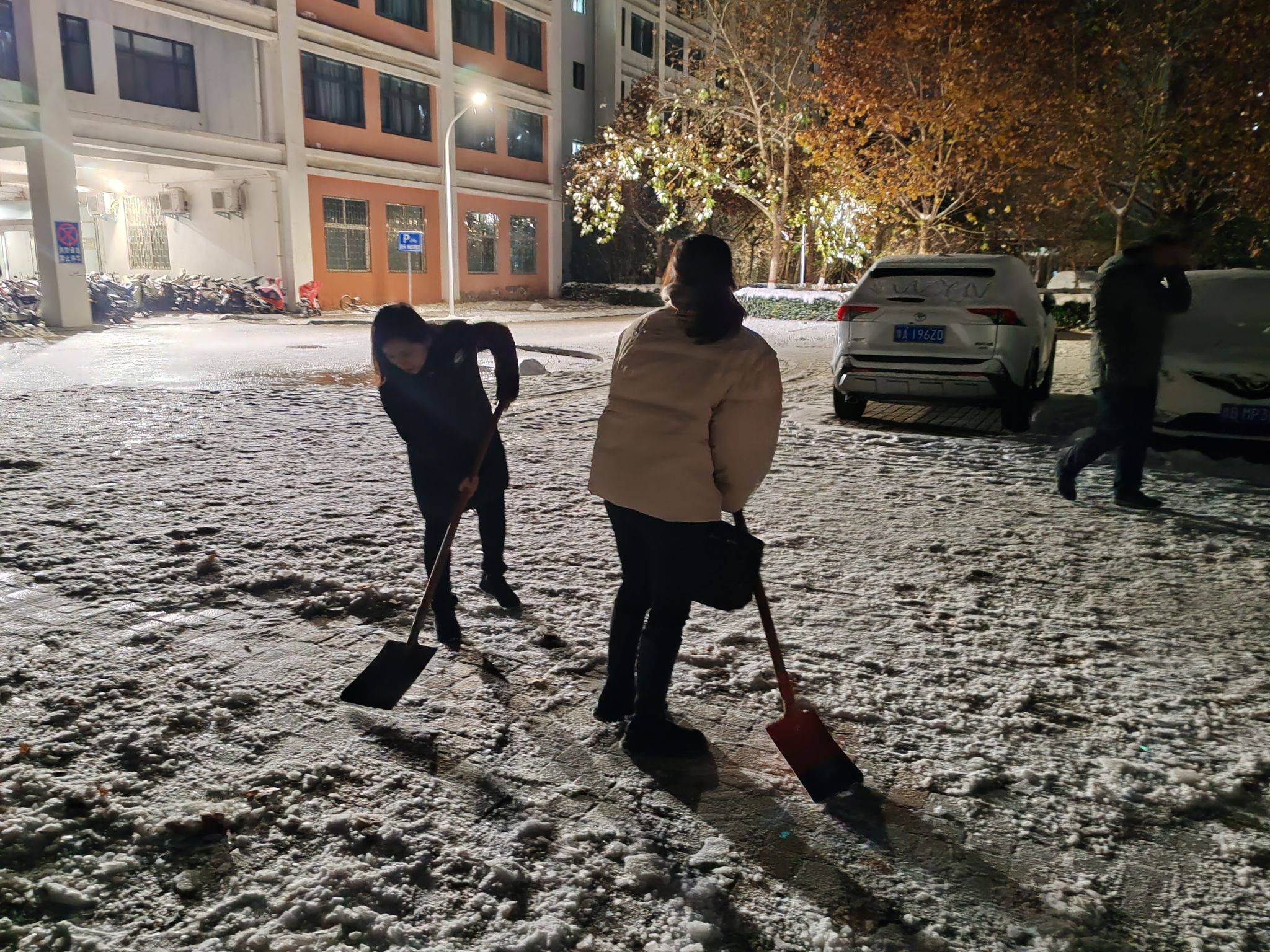 12月15日,又一场大雪降临,雪花漫天飞舞,处处银装素裹。瑞雪带来美景的同时,也为师生安全带来隐患。为消除道路安全隐患,保证明日早上学生四六级考试顺利进行,近夜晚10点雪停之际,土木建筑学院党委书记南晗、执行院长张建伟组织全体班子成员、教师来到学院出入口,责任主干道开展除冰铲雪活动。