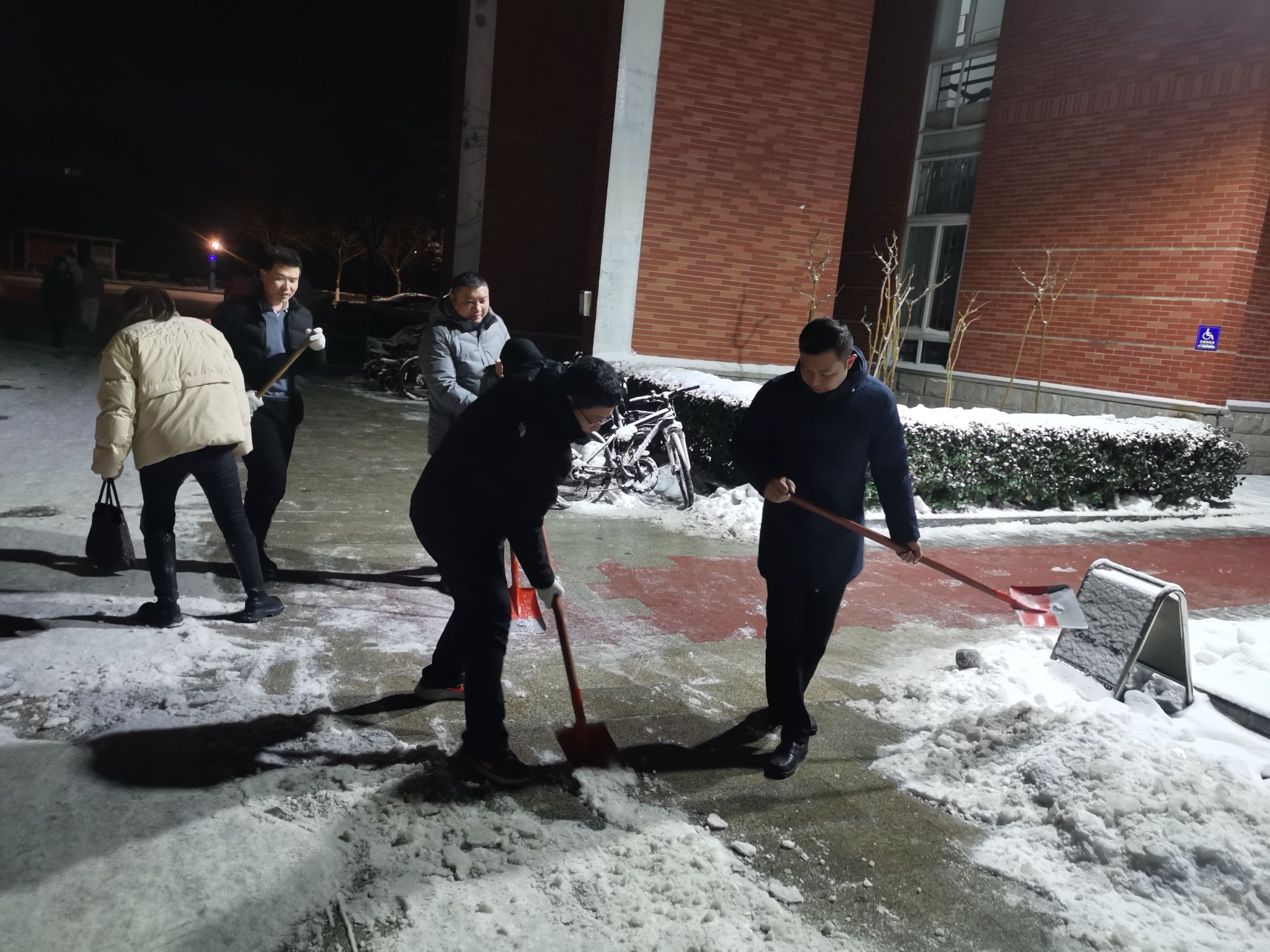 大家相互配合,干劲十足,铲的铲、推的推,虽然天气寒冷,但大家不畏严寒,手中的扫雪工具不停地挥舞着,有条不紊地将路面积雪逐一清理,他们忙碌的身影构成了一副温暖人心的画面。经过大家的共同努力,积雪覆盖的路面被打扫得干干净净,一条平安之路为师生们出行提供了便利条件。